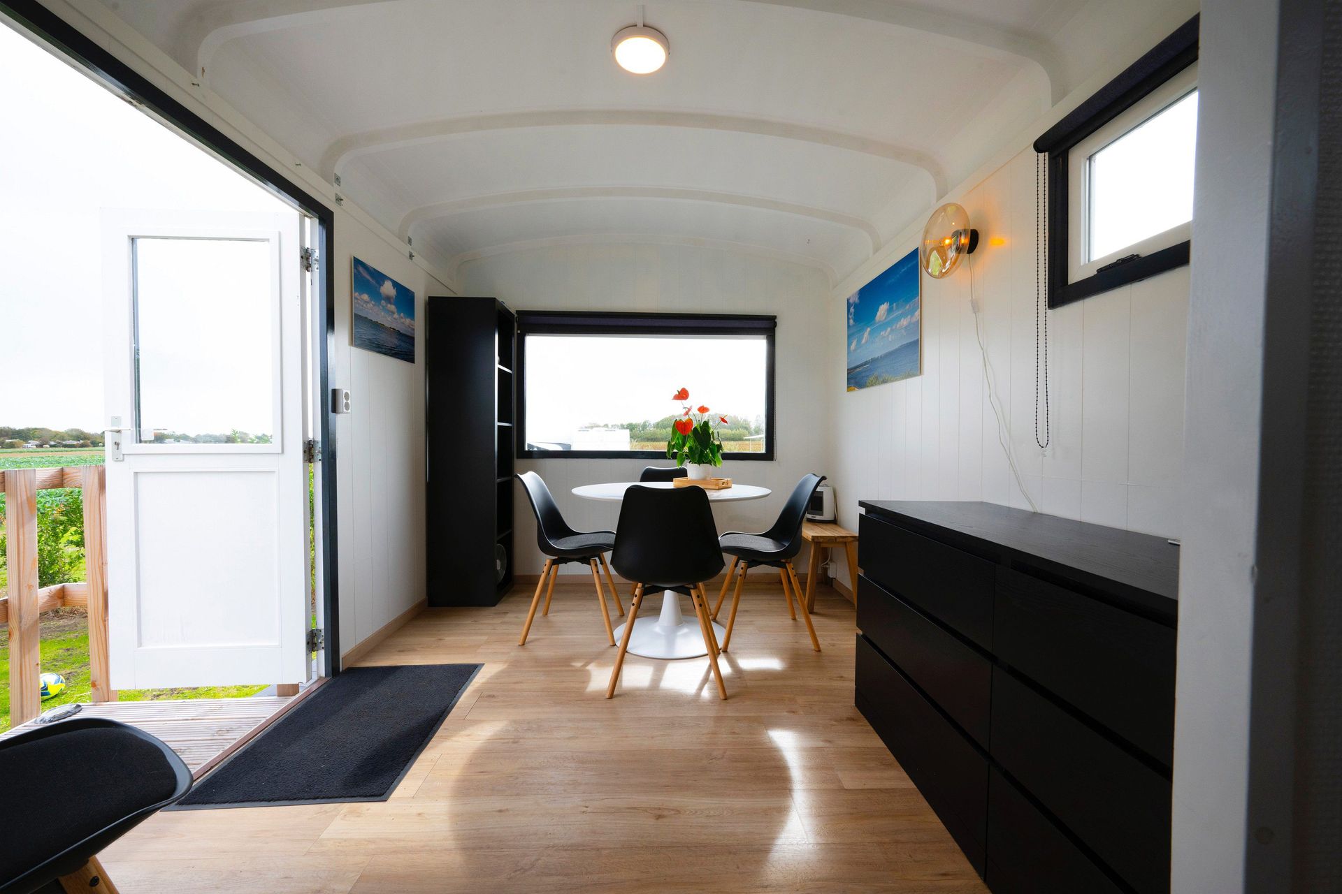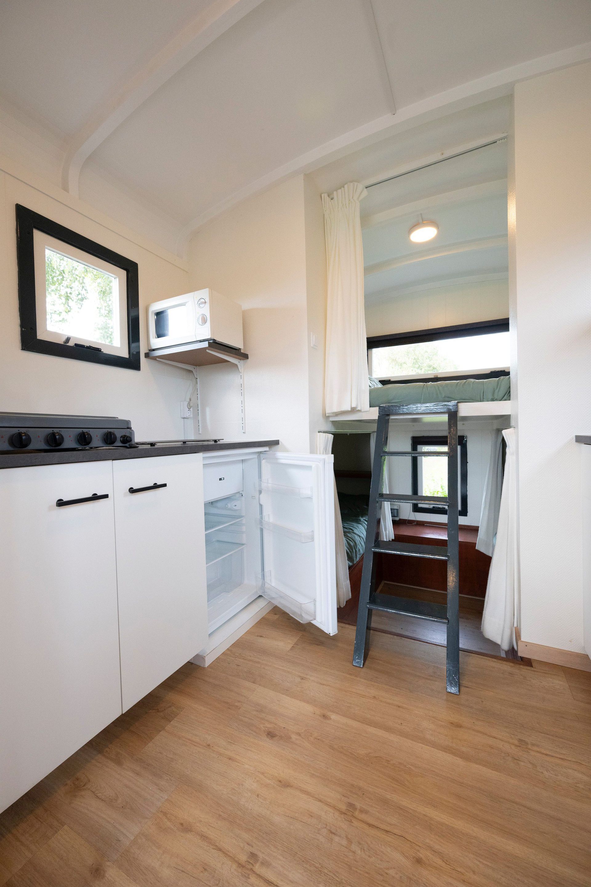 De pipowagen is ingericht voor 4 personen, en beschikt over een slaapkamer met 1 2-persoonsbed (boven) en 2 1-persoonsbedden (onder), een keuken en een woongedeelte.
